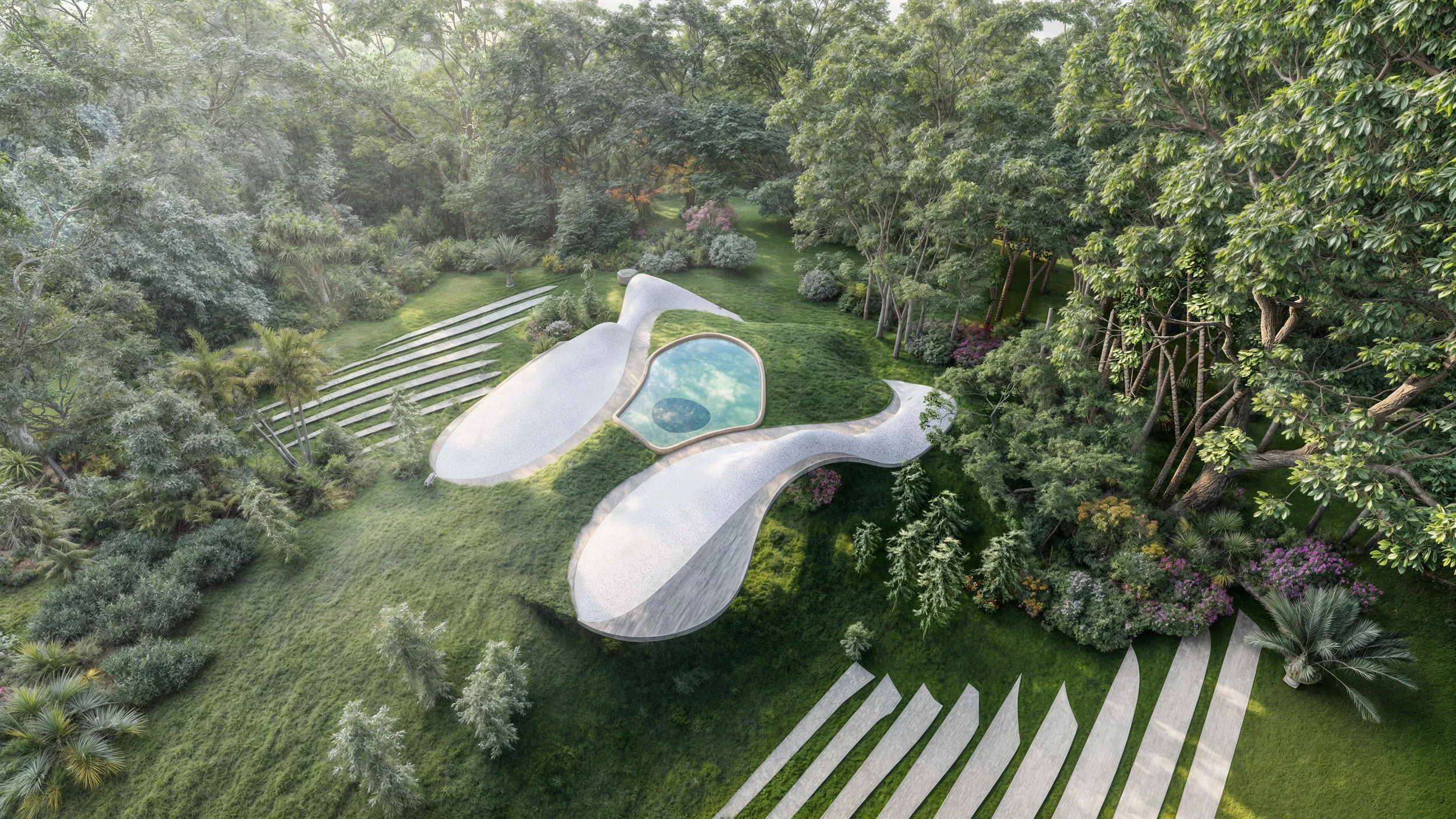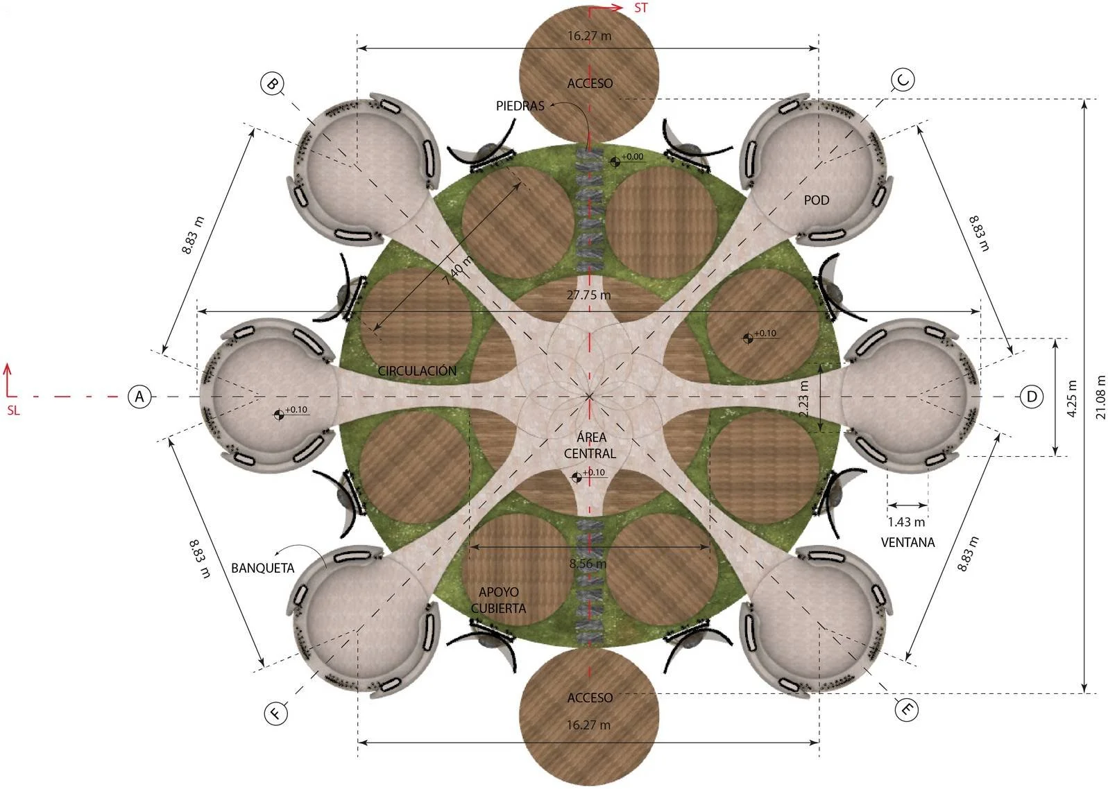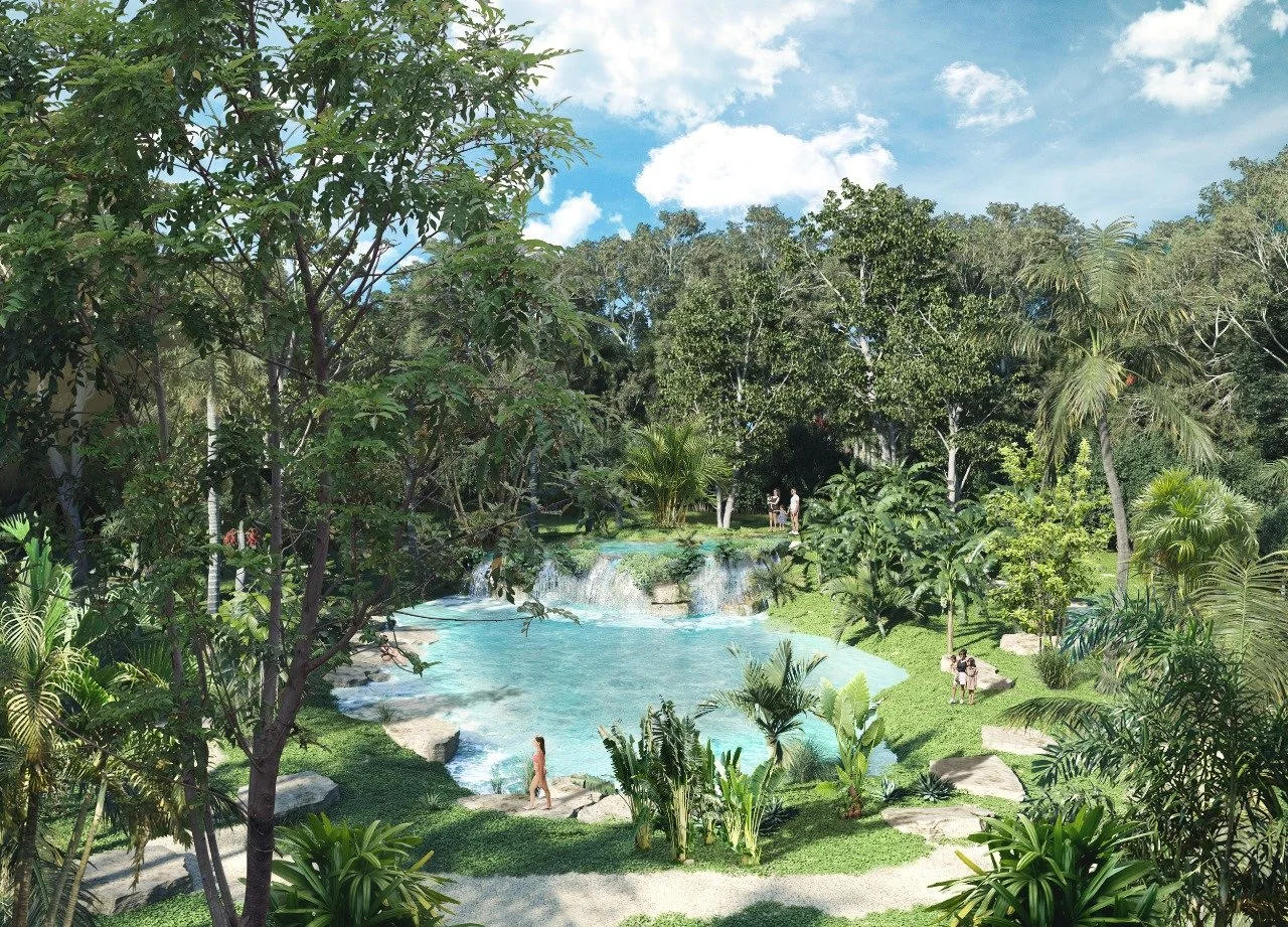 Where the water meets the earth, discover a ceremonial space designed in the shape of a butterfly that invites reflection and connection. Featuring a central waterfall and large stone ruins, the Mayan Temple’s design represents the three worlds of the Maya El Cielo, La Tierra, and El Inframundo. With a small amphitheater for intimate concerts and workshops, the space merges with a dedicated apiculture zone, honoring the melipona “stingless” bee and the delicate ecosystems that sustain life.