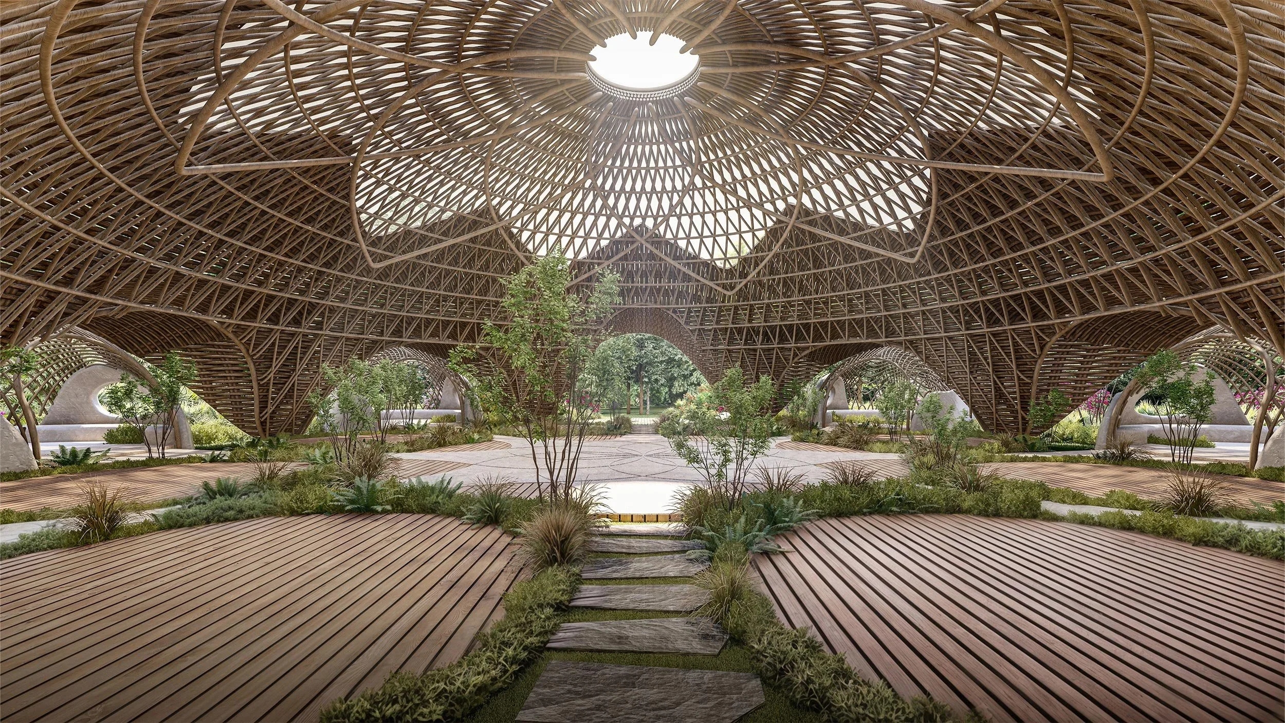 A sanctuary of stillness and strength, the Meditation Gompa unites ancient wisdom with cutting-edge bamboo engineering, embodying form and function in harmony. Rooted in sacred geometry, its architecture integrates the Flower of Life and torus forms to create a natural, protective energetic field that deepens your meditation, breathwork, or sound healing journey. Within, an intentional energetic grid—crafted with quartz and amethyst crystals, copper, and locally sourced bamboo—attunes and balances the space.